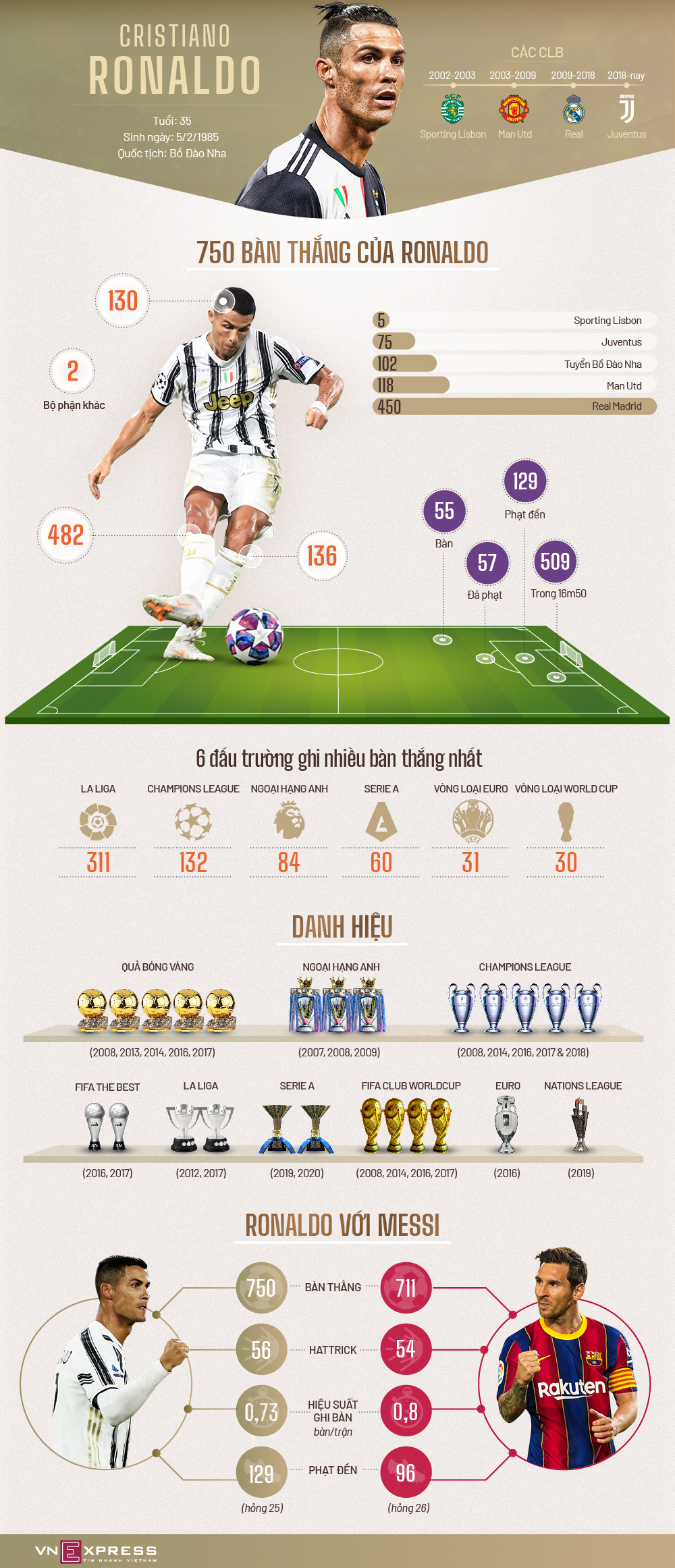Trong bảng thành tích của Ronaldo, có đến 450 bàn anh ghi trong màu áo Real Madrid. Ngoài ra, tiền đạo người Bồ Đào Nha còn có 118 bàn cùng Man Utd, 75 bàn cho Juventus và 102 bàn khi chơi cho tuyển Bồ Đào Nha.