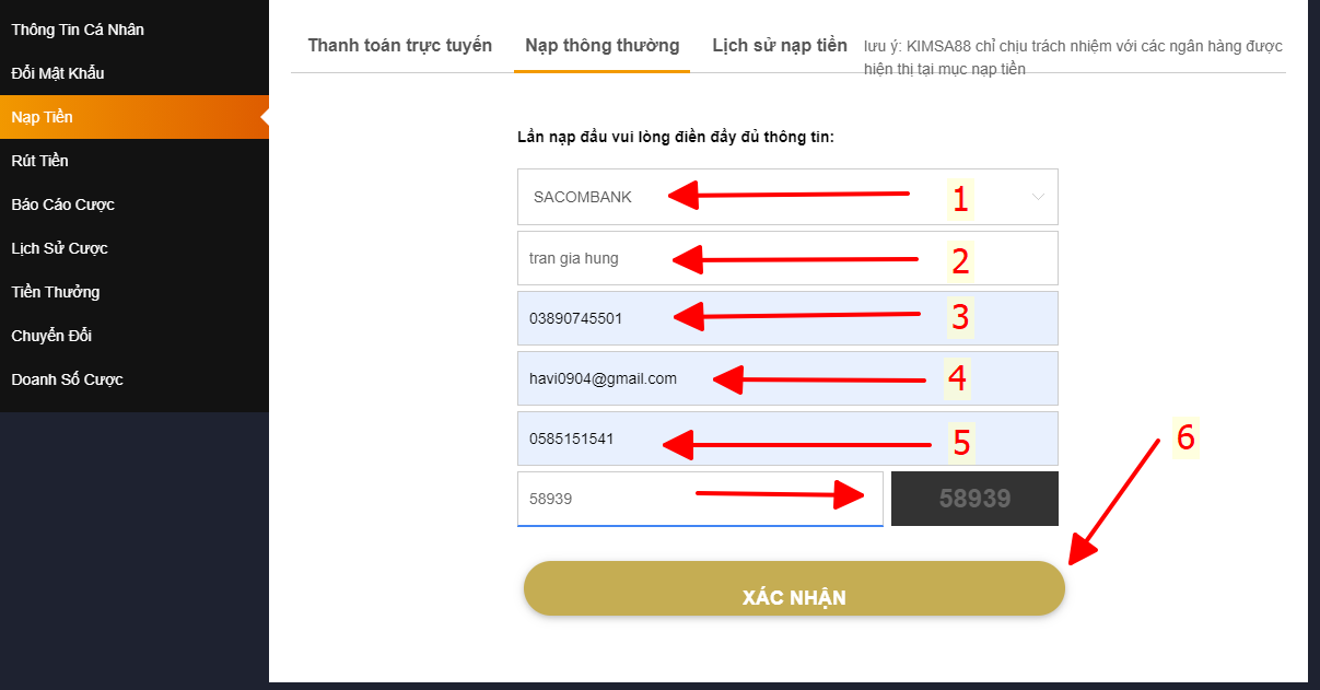 Bước 2:bấm vào nạp tiền và điền thông tin hội viên vào