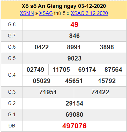 Xem lại kết quả xổ số đài An Giang 3/12/2020 thứ 5 tuần qua đầy đủ giải đặc biệt, giải 8, lô tô 2 ố, bạch thủ lô trước khi đưa ra các phân tích, nhận định chốt số dự đoán chuẩn xác.