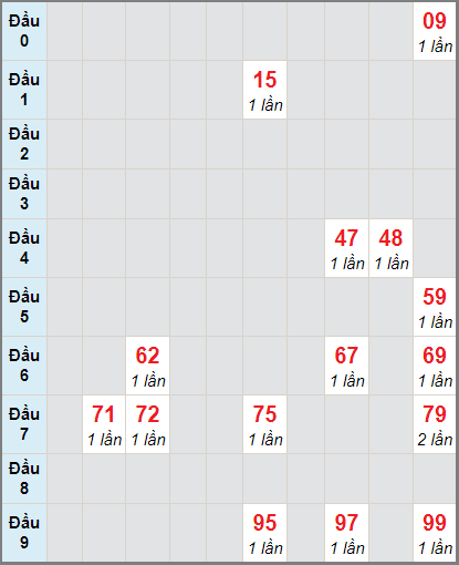 - Soi cầu XS AG biên độ cầu 3 ngày: 09 15 47 48 59 62 69 72 75 79 95 97 99