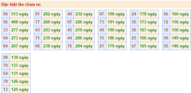 • Tổng gan (lâu ra) của giải đặc biệt: Tổng 7 (4 ngày), tổng 2 (15 ngày), tổng 1 (1 ngày), tổng 5 (3 ngày), tổng 4 (8 ngày), tổng 3 (23 ngày), tổng 0 (6 ngày), tổng 6 (5 ngày), tổng 8 (Mới ra hôm qua), tổng 9 (7 ngày).